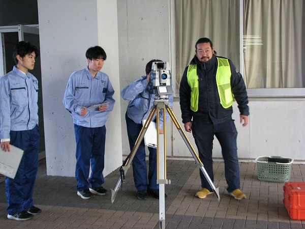 屋内授業では、『土地家屋調査士の1日』紹介動画の視聴、仕事内容の説明、土地家屋調査士試験の説明、土地家屋調査士による体験談発表。屋外授業では、トータルステーションとテープを使用した測量、GNSS(GPS)ネットワーク型RTK法による埋設物の探索、3Dレーザースキャナーを使用した測量の体験を行いました。