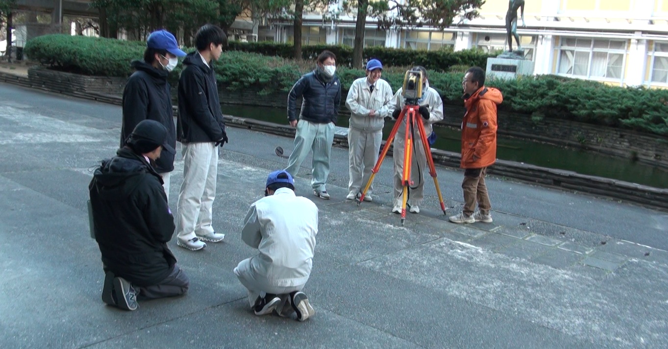 屋内授業では、『土地家屋調査士の1日』紹介動画の視聴、仕事内容の説明、土地家屋調査士試験の説明、土地家屋調査士による体験談発表。屋外授業では、トータルステーションとテープを使用した測量、GNSS(GPS)ネットワーク型RTK法による埋設物の探索、3Dレーザースキャナーを使用した測量の体験を行いました。